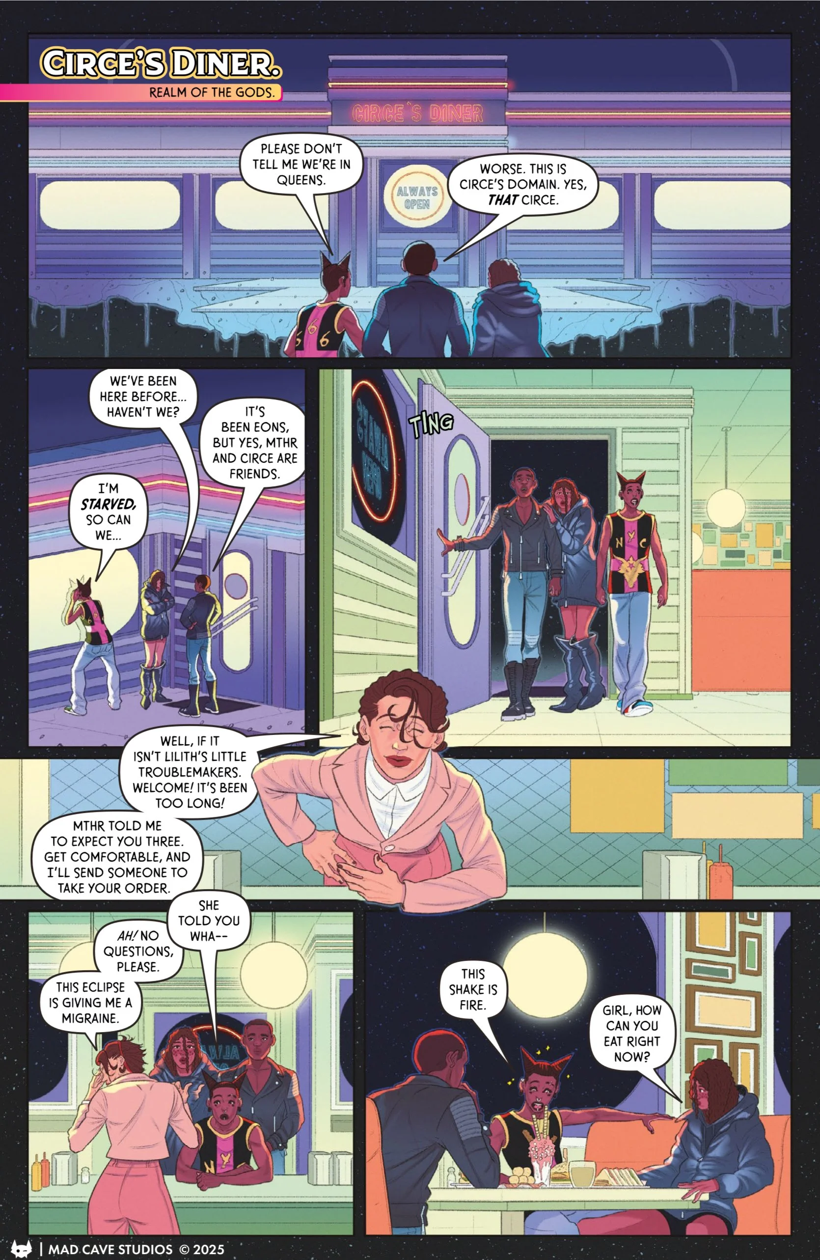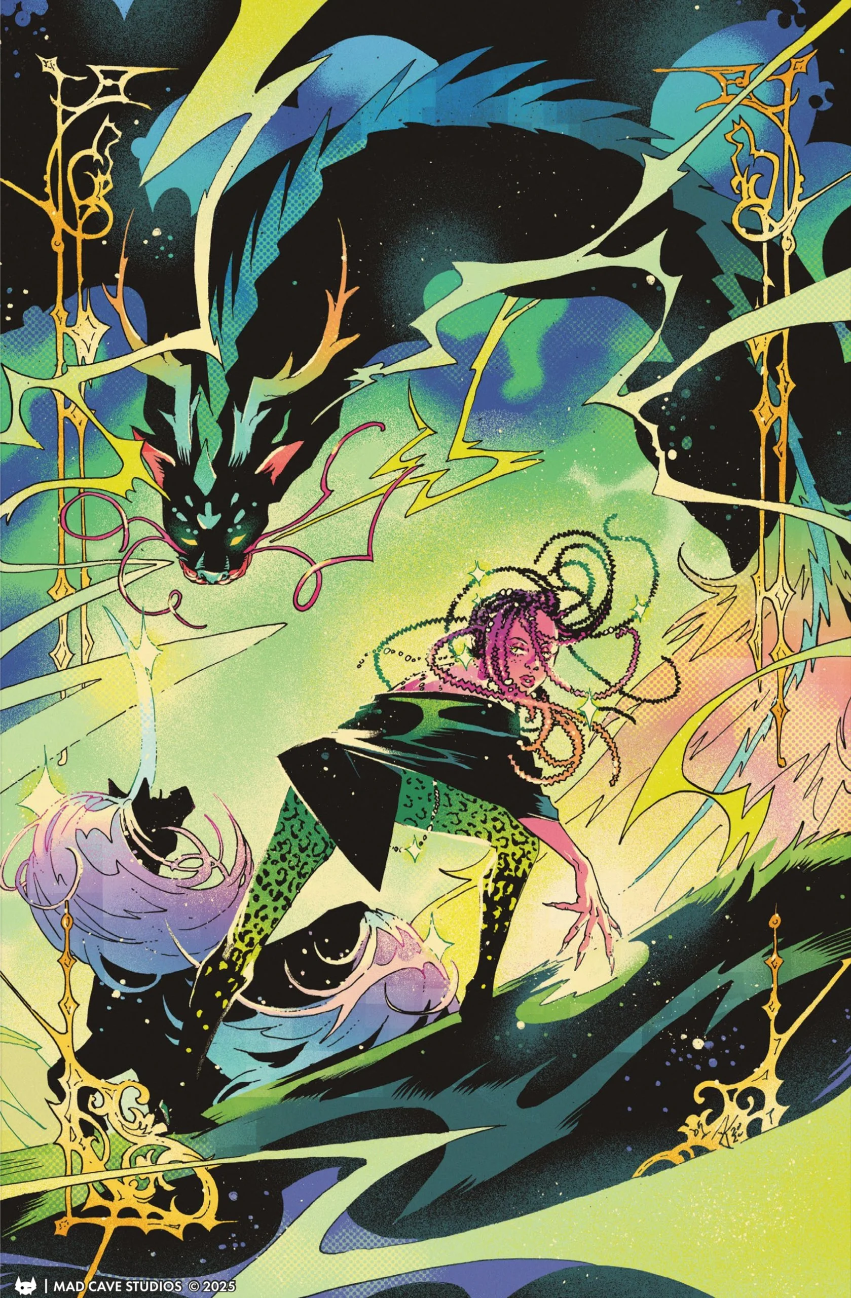 The stunning one-of-a-kind art by Lema Carrill provides the story with bold and distinct characterization and scene setting. His vintage art style and intricate line work makes you cherish each page as if it was a gifted trinket. The queerness, experimental fashion, and fluid androgyny, combined with Bex Glending’s striking, eccentric colors, sets the stage for powerful storytelling through Morgan Martinez’ lettering.