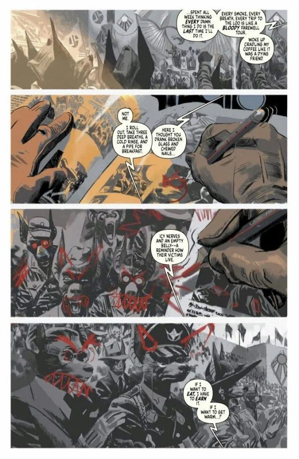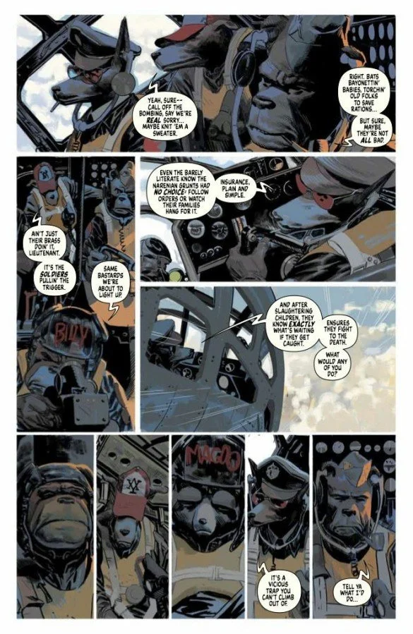 One of the most interesting things the reader will notice is how Remender uses animal symbolism to represent the different factions. The "good guys" are represented by a group of cats and dogs, a dynamic that clearly hints at the potential friction and uneasy alliances within their own ranks. On the other side, the enemy is depicted as a collective of bats, which are often associated with the darkness and the unknown. The gritty artwork by Daniel Acuña - who readers might also recognize from his recent collaboration with Chip Zdarsky on Avengers: Twilight - fits perfectly with the gravity of the story. Acuña excels at merging realism with surreal elements, making the presence of anthropomorphic animals feel both uncanny and oddly believable. His use of dark palettes adds weight to each scene, giving the artwork a decisive tone that reinforces the story’s tension and complexity. Finally, Remender leaves little room for ambiguity: the reader will notice how the uniforms of the enemy faction create a distinct and unsettling visual link to the Nazi regime.