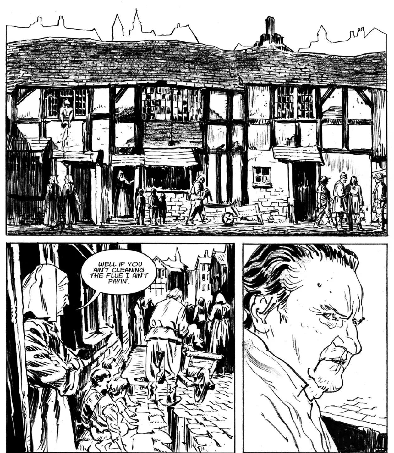 As this is the series premiere, there are lots of possibilities for where Ash’s story can go. Part 1 begins with dirty cobblestone streets filled with beggars and then shows an older Ash surrounded by grunt work near dead animals. Whether or not this is symbolic of Ash’s journey remains to be seen, but by the last few panels readers will be curious about what he makes of his situation.