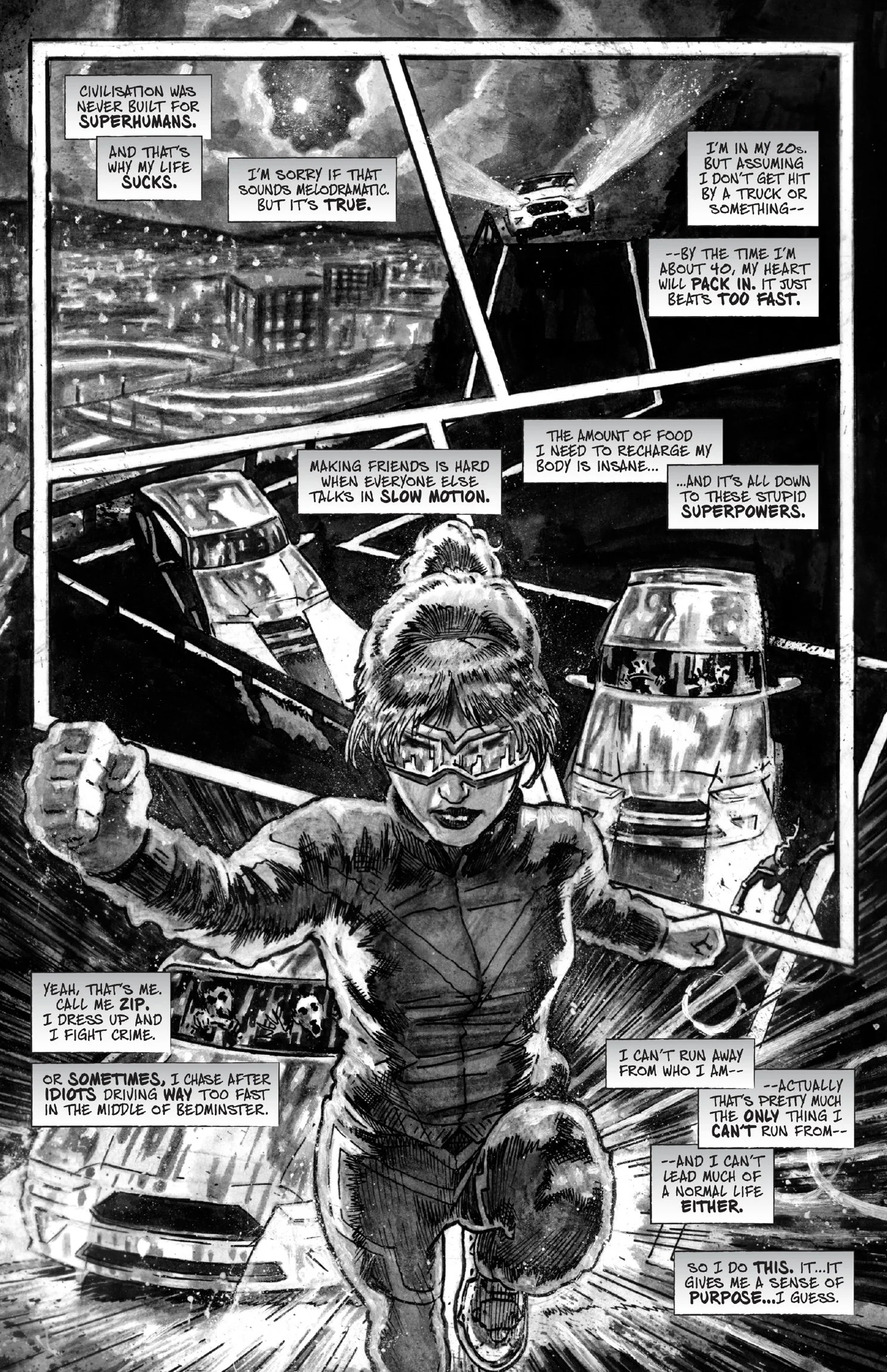 The story introduces Allison, a.k.a. Zip, who is trying to lead two lives: being a superhero and a responsible woman. Her powers, which make her different from the others, are also her curse. For her, the world moves so slowly she fails to keep her job, dating is almost impossible, and she also struggles to take care of her - let's just say - grandfather. It is when all hope is lost that Zip is involved in a life-changing event that will give her renewed faith in herself and the world. By the end of this first issue, though, readers will realise that someone is after her and wants her gone.